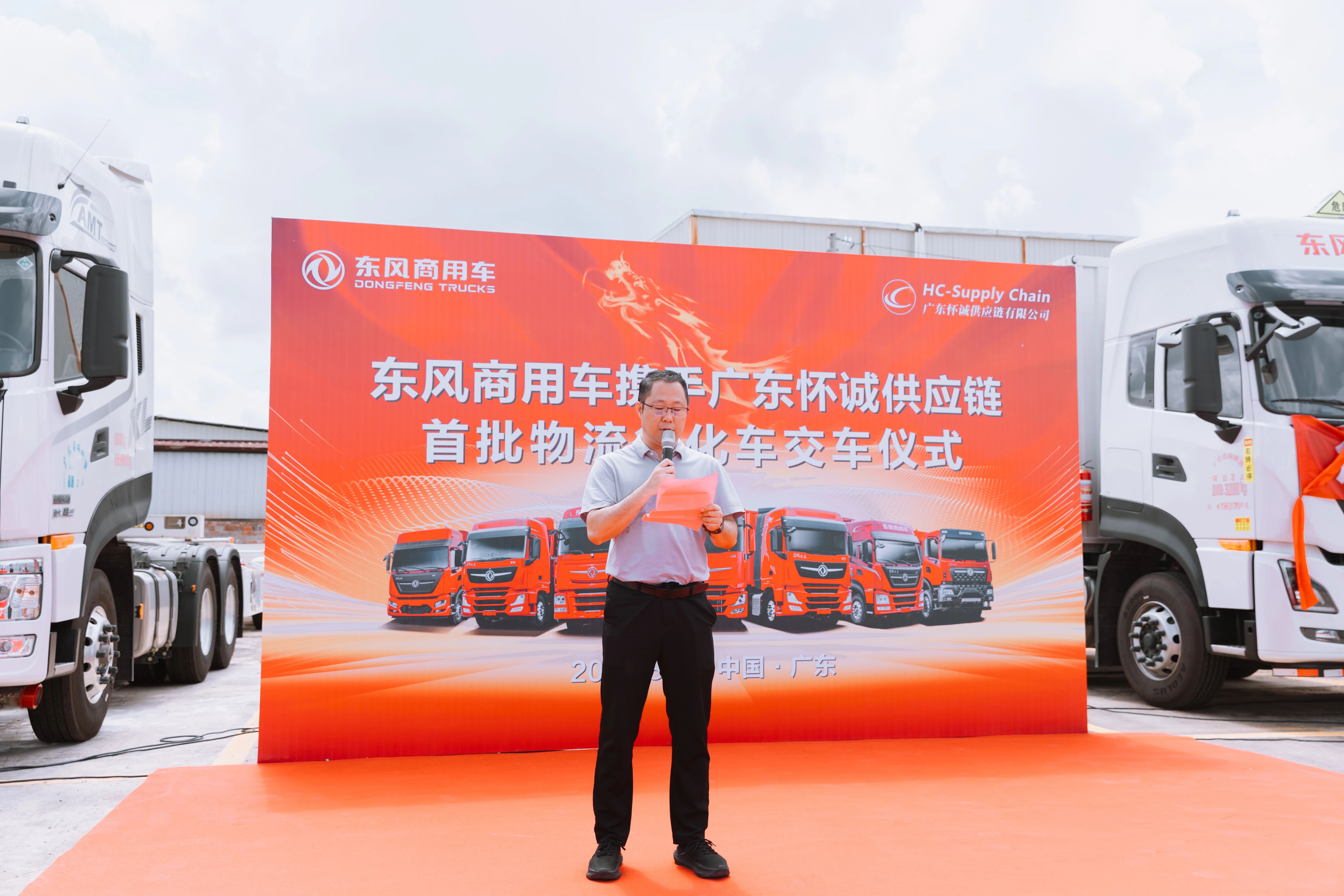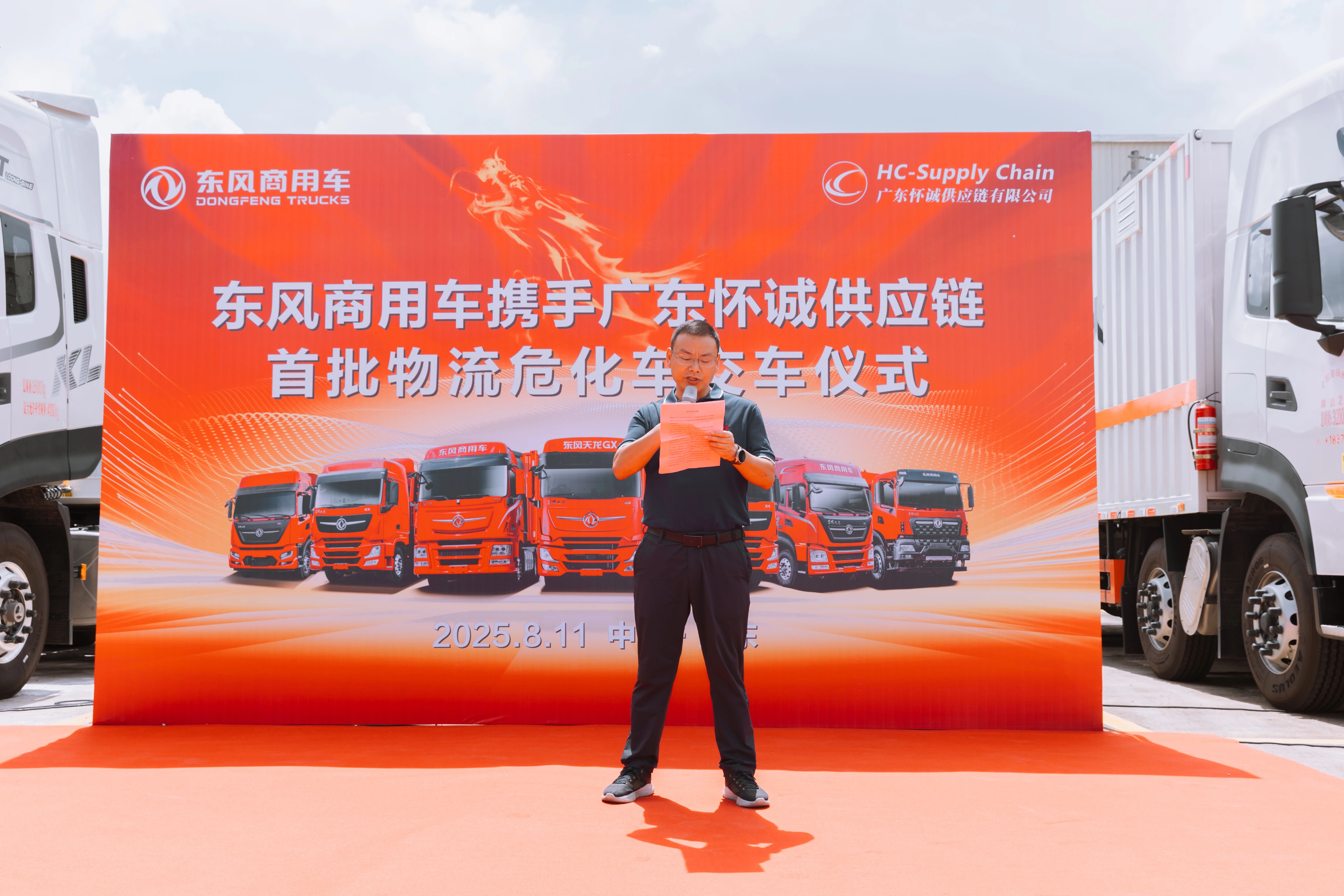 东风商用车粤闽桂省级运营总经理权总率先致辞。他表示,东风商用车作为中国商用车领域的领军品牌,50余年来始终将“安全、可靠”刻在东风品牌基因里,凭借可靠品质、创新技术和贴心服务陪伴万千伙伴共创价值。此次与广东怀诚供应链的携手,既是产品交付,更是信任的见证和责任的开始。未来将以更优质服务助力怀诚高质量发展。