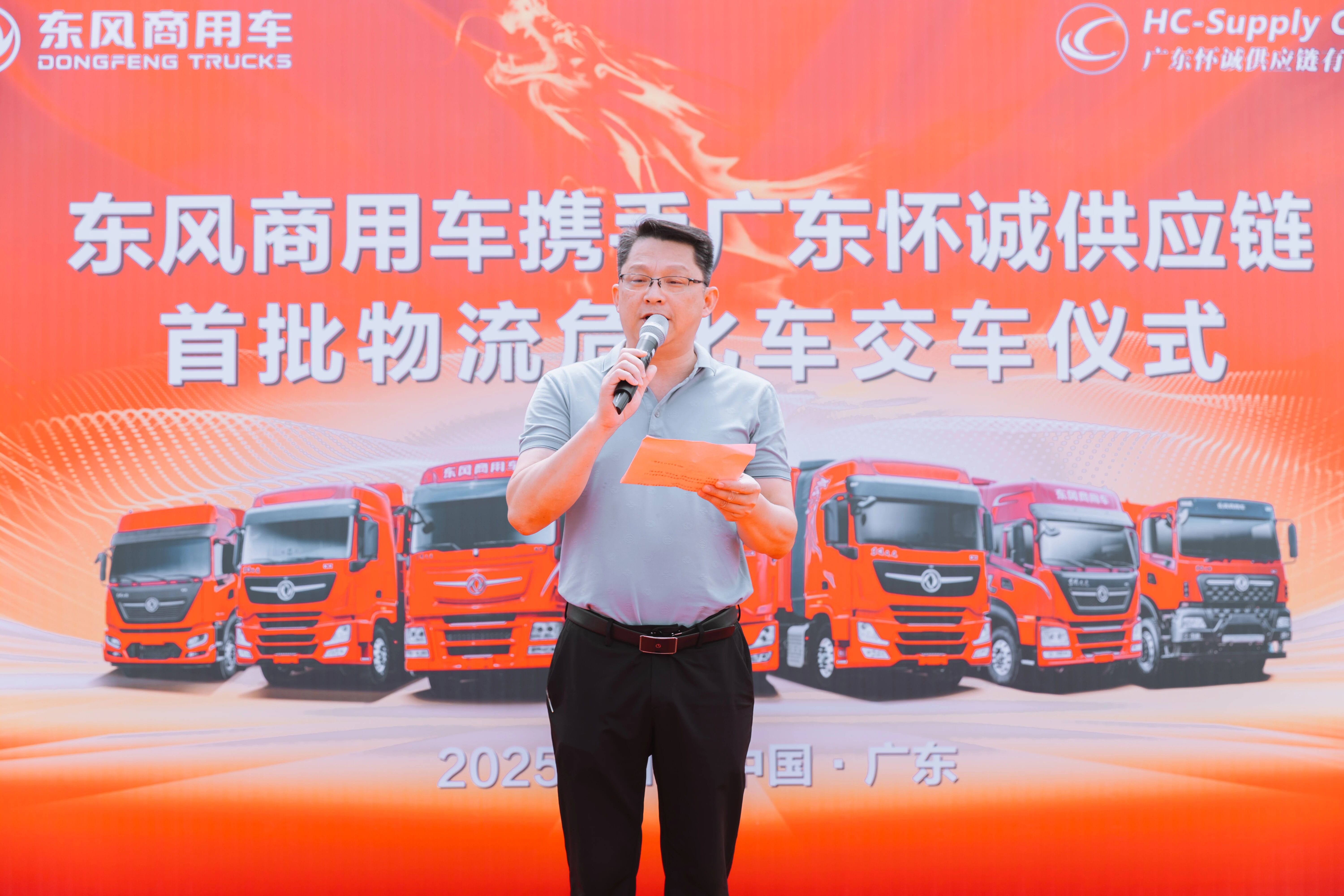 东风商用车粤闽桂省级运营总经理权总率先致辞。他表示,东风商用车作为中国商用车领域的领军品牌,50余年来始终将“安全、可靠”刻在东风品牌基因里,凭借可靠品质、创新技术和贴心服务陪伴万千伙伴共创价值。此次与广东怀诚供应链的携手,既是产品交付,更是信任的见证和责任的开始。未来将以更优质服务助力怀诚高质量发展。